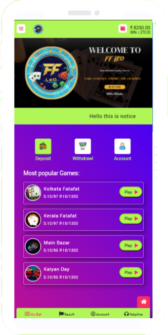 Experience the thrill of popular games like Kolkata Fatafat, Kalyan, Main Bazar, and more — all in one seamless platform. Whether you're a seasoned player or a beginner, FF LEO is your go-to destination for non-stop excitement and instant rewards!